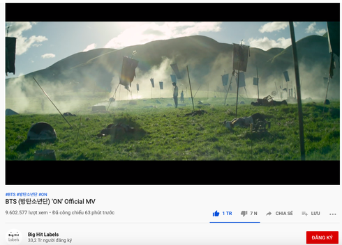 Ngoài ra, dù phát hành lúc nửa đêm nhưng MV "ON" của BTS vẫn đang nhận được lượt view cực "khủng" khi chưa đầy 1 tiếng đã đạt gần 10 triệu view kèm 1 triệu lượt like.