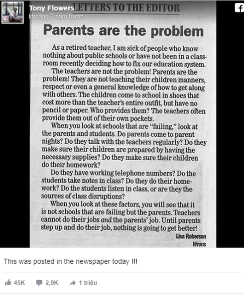 Bức thư gây tranh cãi khi cho rằng "phụ huynh là nguyên nhân nền giáo dục thất bại"