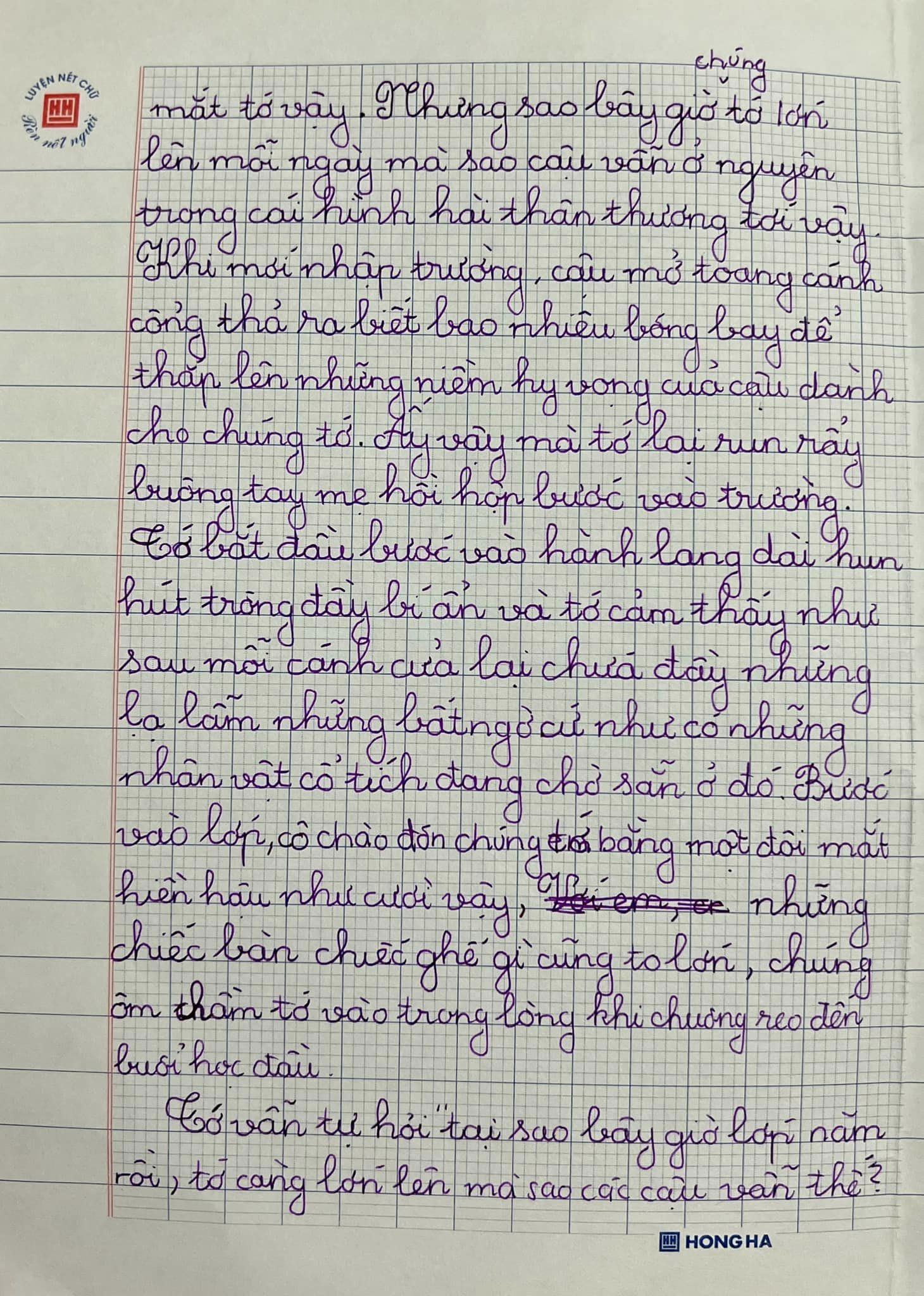 Từ những phút giây còn bỡ ngỡ trong ngày đầu bước tới cánh cổng trường: “Ấy vậy mà tớ lại run rẩy buông tay mẹ, hồi hộp bước vào trường” cho tới tâm trạng bồi hồi khi tận hưởng kỳ nghỉ hè cuối cùng: “Nhưng hè này, phượng vẫn nở hoa, trường vẫn trầm tư trong ánh nắng vàng, nhưng… chúng tớ sắp phải xa trường mãi mãi rồi…” được em viết đầy cảm xúc.