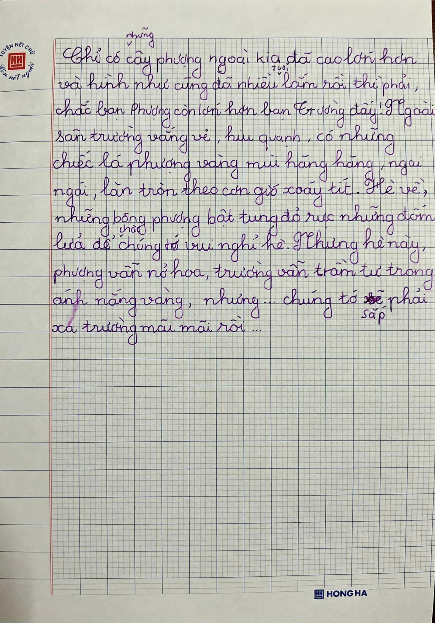 Tớ vẫn tự hỏi tại sao bây giờ lớp năm rồi, tớ càng lớn lên mà sao các cậu vẫn thế? Chỉ có những cây phượng ngoài kia đã cao lớn hơn và hình như cũng đã nhiều tuổi lắm rồi thì phải, chắc bạn phượng còn lớn hơn bạn Trường đấy! Ngoài sân trường vắng vẻ, hiu quạnh, có những chiếc lá phượng vàng mùi hăng hăng, ngai ngái, lăn tròn theo cơn gió xoay tít. Hè về, những bông phượng bật tung đỏ rực những đốm lửa để chào chúng tớ vui nghỉ hè. Nhưng hè này, phượng vẫn nở hoa, trường vẫn trầm tư trong ánh nắng vàng, nhưng… chúng tớ sắp phải xa trường mãi mãi rồi…”