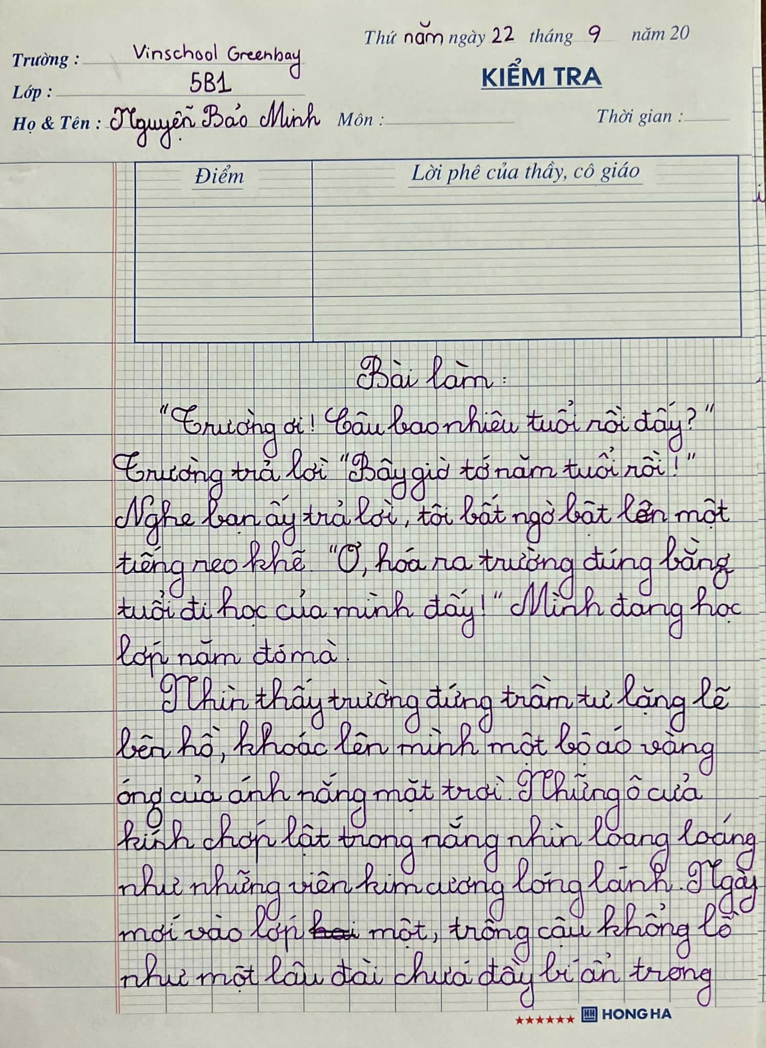 Được biết, chủ nhân của bài văn đầy lắng đọng này là bé Nguyễn Bảo Minh, học sinh lớp 5, Trường tiểu học Vinschool Green Bay (Hà Nội). Cách đây không lâu, Bảo Minh từng khiến cộng đồng mạng thích thú với bài văn tả cơn mưa sống động như văn mẫu.