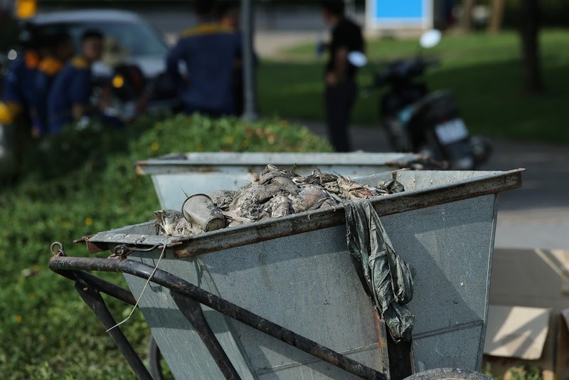 Đội vệ sinh môi trường đã huy động người vớt cá chết liên tục từ ngày hôm qua đến chiều nay. |