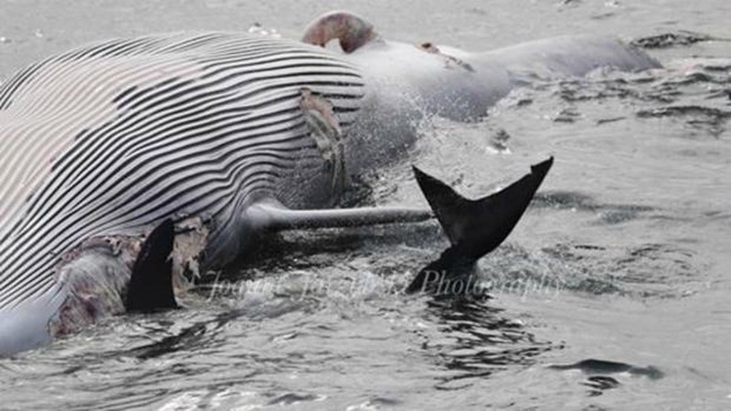 Joanne Jarzobski cho biết hiện chưa rõ nguyên nhân vì sao con cá voi chết. Con cá mập kích thước lớn nhưng con cá voi to hơn gấp nhiều lần. |