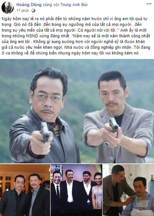 NSND Hoàng Dũng cũng trân trọng gửi lời chúc mừng đến người bạn diễn của mình. Ông bày tỏ sự trân trọng tất cả những cống hiến với nghề của NS Trung Anh. |