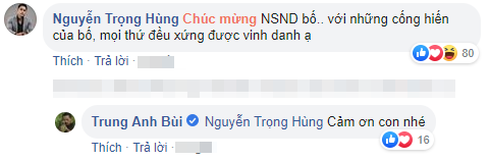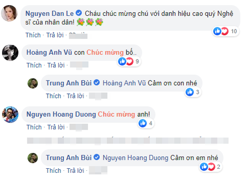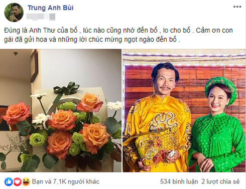 Mới đây, nghệ sĩ Trung Anhđã đăng tải hình ảnh bó hoa chúc mừng của "con gái" Anh Thư (Bảo Thanh) trước ngày ông chính thức nhận phong tặng danh hiệu Nghệ sĩ Nhân dân (NSND).