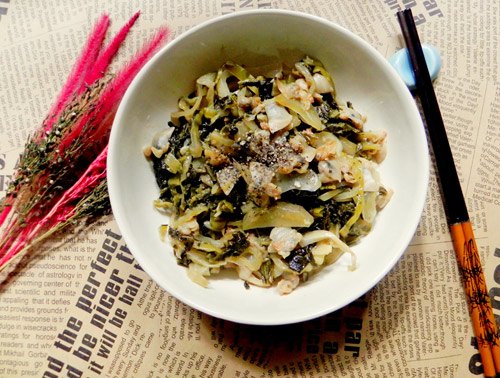 Cho dưa chua xào tóp mỡ ra đĩa ăn với cơm nóng rất đưa cơm.