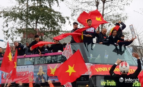 Đội tuyển U23 Việt Nam trong vòng vây hân hoan của người hâm mộ. |