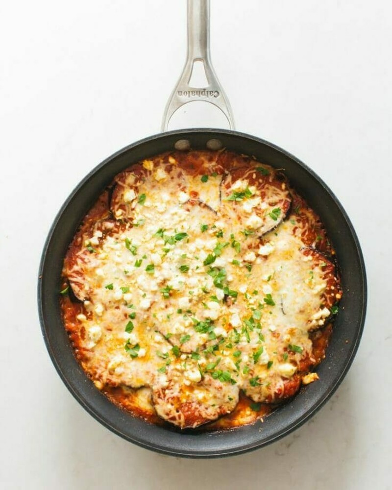 Cà tím cắt lát cho vào chảo nướng, đổ nước sốt yêu thích và rắc phô mai các loại lên, đặc biệt là phô mai Mozzarella, cho vào lò nướng là chờ đợi bữa tối thơm ngon, béo ngậy sẵn sàng.