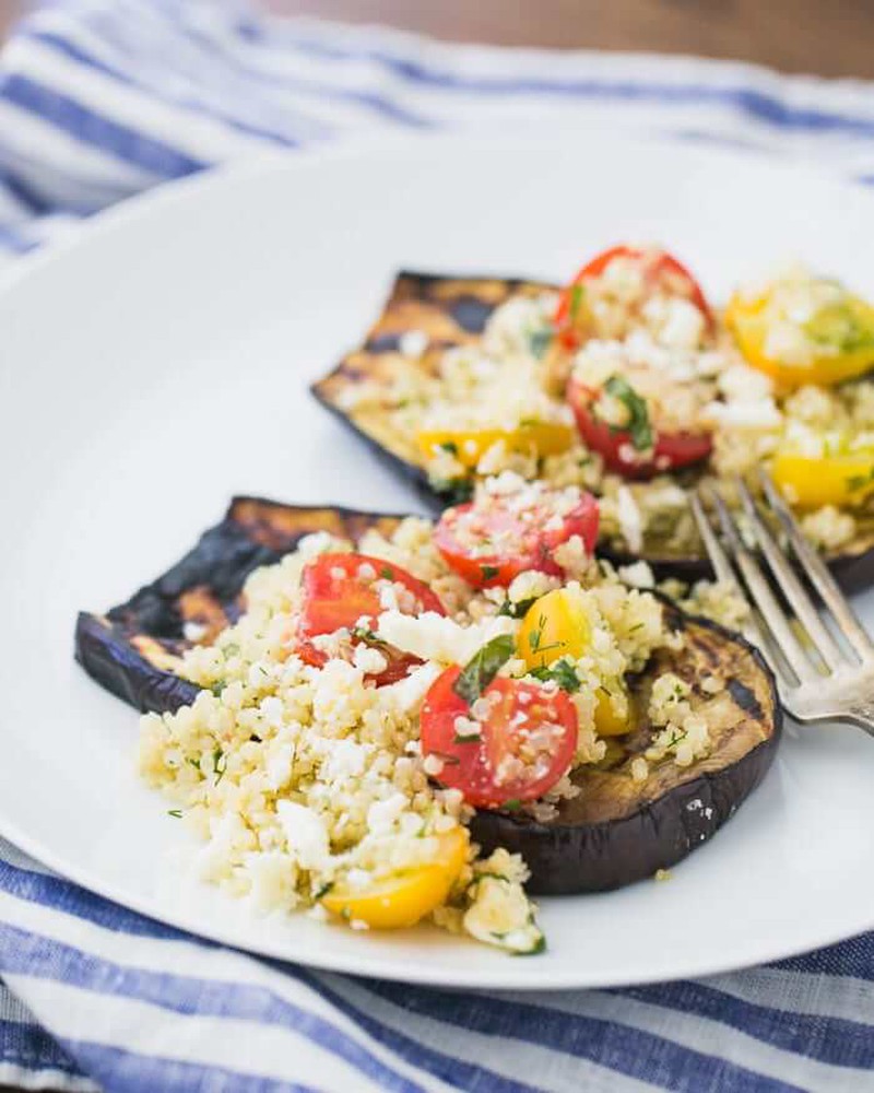 Đây là cách chế biến theo kiểu Địa Trung Hải. Cà tím cắt đôi, phết nước sốt, xếp cà chua, hạt quinoa, thì là và cho vào lò nướng là hoàn thành.