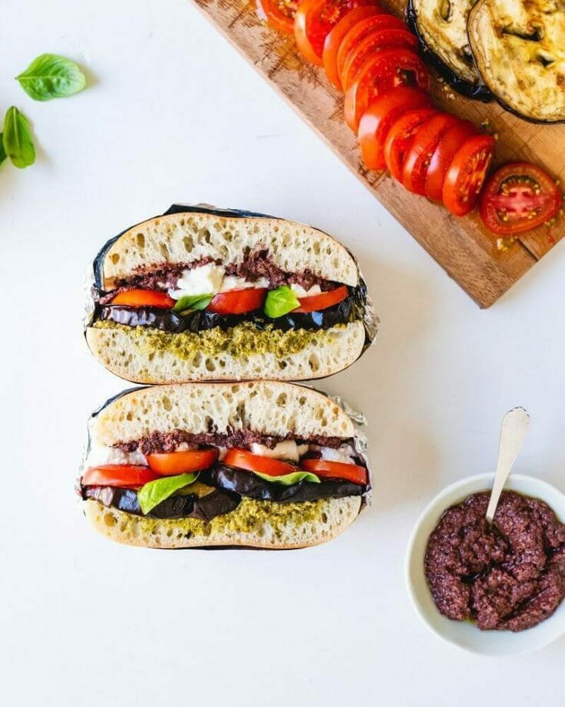 Một cách ăn vô cùng mới lạ, một dạng bánh sandwich. Sandwich cà tím có cà chua, cà tím nướng, phô mai Mozzarella tươi, húng quế, dầu ô liu, rất ngon và không gây ngán.