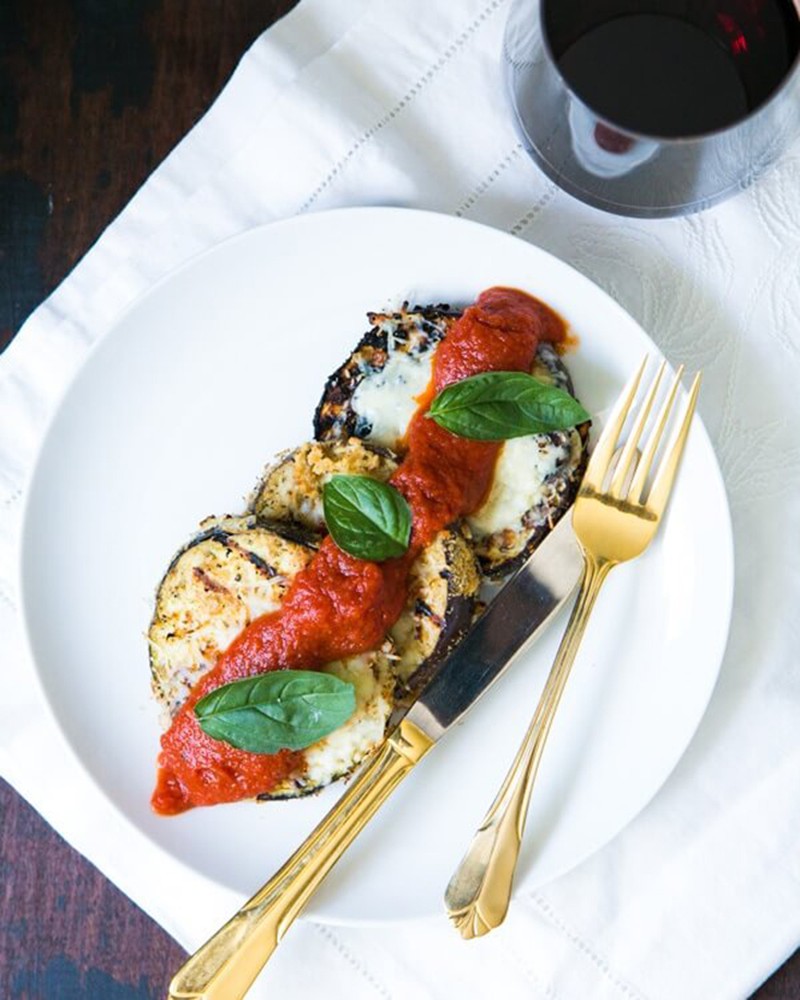 Cà tím cắt lát, nướng trên vỉ nướng cháy cạnh cả 2 mặt, sau đó ăn cùng với nước sốt cà chua và lá húng quế.