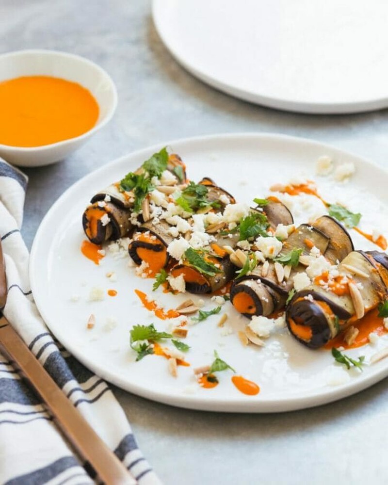 Cà tím cắt thành dải dài, cuộn với nước sốt làm từ hạnh nhân, tỏi và ớt chuông đỏ, sau đó đem nướng hoặc hấp là xong.