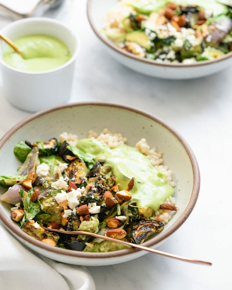 Salad này sử dụng bất kỳ loại hạt nào tùy ý như hạt quinoa, hạt kê, thậm chí là cả cơm trắng. Đối với rau thì cà tím nướng, hành tây, xà lách... trộn với nước sốt là xong bữa trưa lành mạnh.