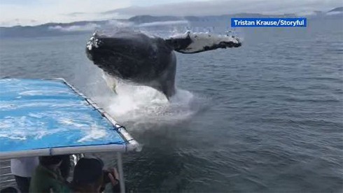 Cá voi bay trên mặt nước, suýt rơi trúng thuyền chở khách
