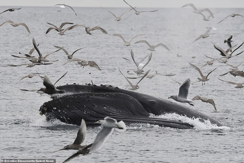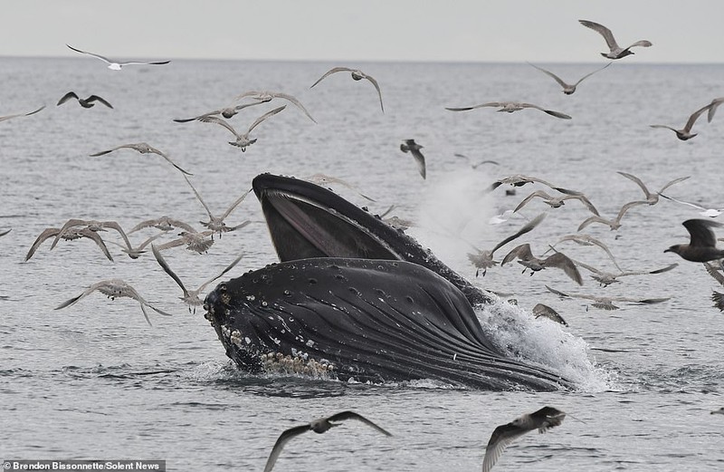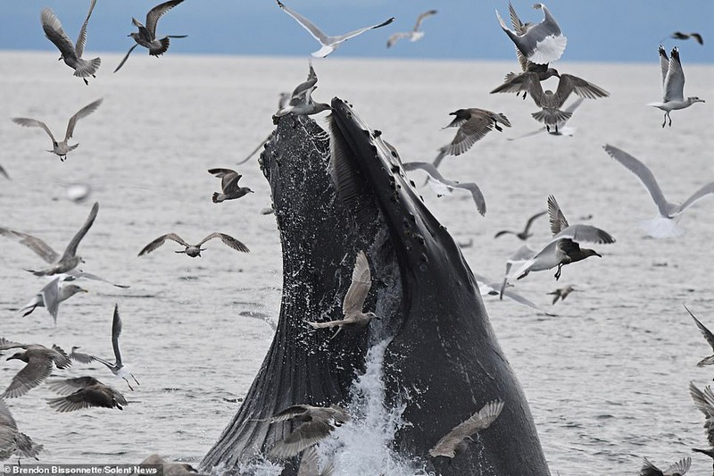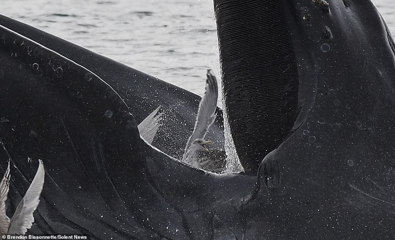 Một vài con hải âu luống cuống cố gắng thoát khỏi chiếc miệng rộng khi cá voi mở miệng, hạ thân chìm xuống nước. Một vài con nhanh chóng trốn thoát.