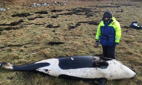 Một người dân địa phương phát hiện xác con cá voi sát thủ đực còn non trên bãi cỏ ven bờ biển phía tây hòn đảo chính của quần đảo Shetland ở Scotland sau gần ba tuần bão Caroline đổ bộ vào đây, Express hôm 21/12 đưa tin. Con cá voi khoảng 2-3 tuổi và dài ba mét mắc cạn được cho là chết do mất nước hoặc đập mạnh xuống đất. Vị trí tìm thấy con vật cách bờ biển ít nhất 25 mét.