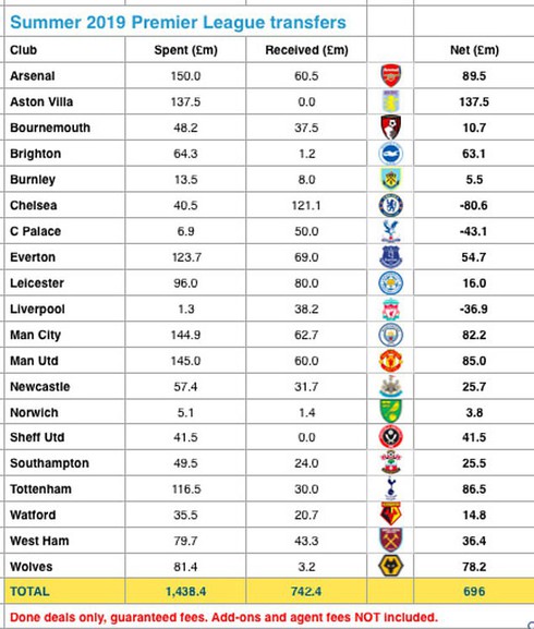 Theo thống kê, 20 CLB thi đấu tại Premier League đã chi tiêu tổng cộng 1,44 tỷ bảng Anh cho các thương vụ mua sắm trong hè năm 2019, nhằm bổ sung lực lượng trước mùa giải mới. Con số này vượt qua kỷ lục 1,42 tỷ bảng của kỳ chuyển nhượng mùa hè năm 2017.