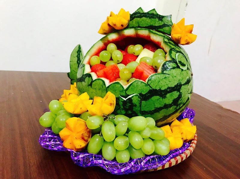 Giỏ hoa quả ngũ sắc từ dưa hấu với sự cách điệu nho nhỏ thể hiện sự khéo tay của bạn sẽ làm cả nhà khen nức nở. |