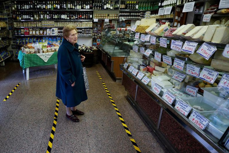 Một cụ bà đứng chờ ở vạch kẻ tại một cửa hàng thực phẩm ở Rome, Italy. |