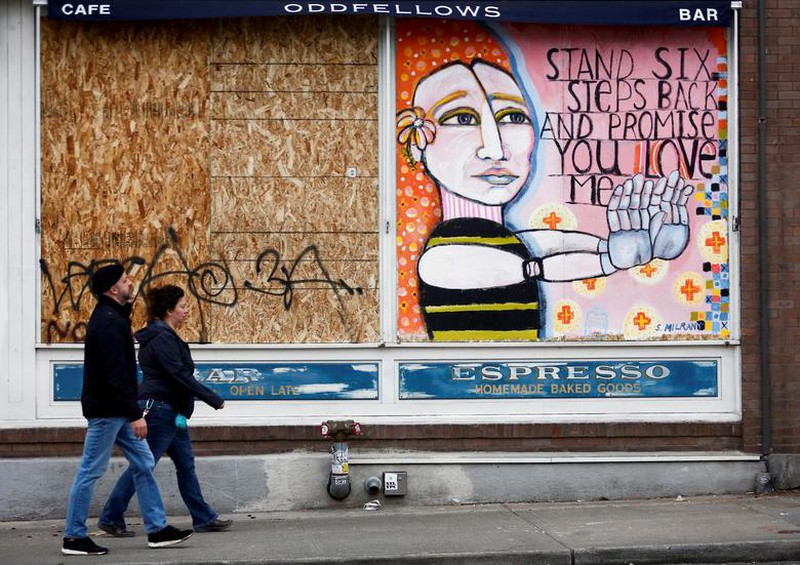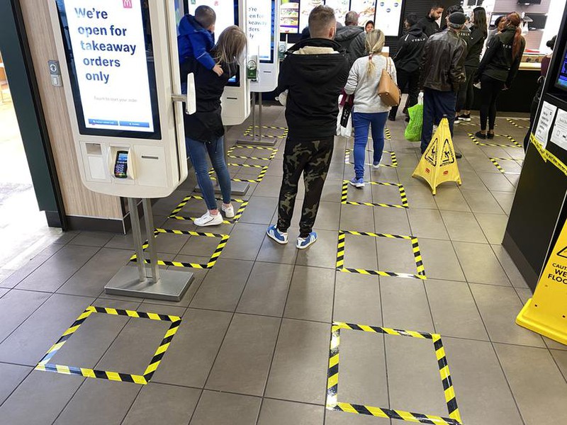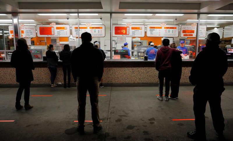 Người dân Seattle, Washington đứng chờ mua đồ ăn theo khoảng cách đã được kẻ sẵn tại một tiệm bán đồ ăn nhanh Drive-in ở Mỹ. |