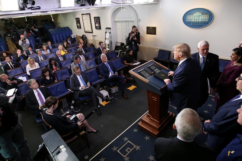 Các nhà báo, phóng viên cũng tuân thủ quy tắc "cách ly xã hội" khi tham dự họp báo ở Washington, Mỹ. |