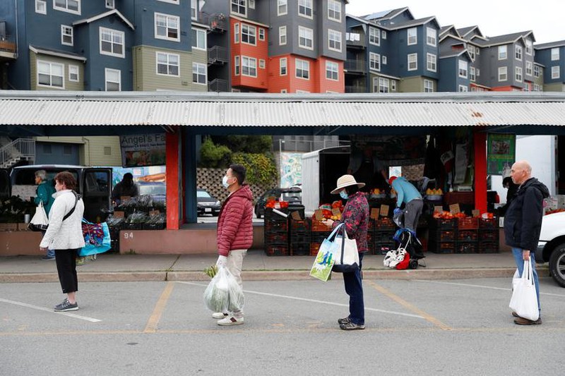 Người mua hàng tuân thủ việc giữ khoảng cách tại khu chợ nông nghiệp Alemany ở San Francisco, California, Mỹ. |