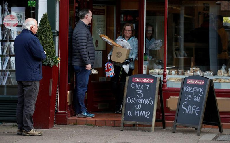 Một cửa hàng bánh ở Hale, Anh đề tấm biển "Mỗi lần chỉ 3 khách vào tiệm", và "Hãy giữ cho chúng ta an toàn" ngoài cửa tiệm. |