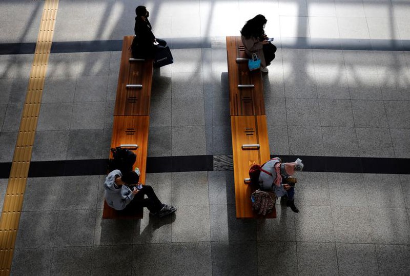Hành khách chờ tàu tại một nhà ga xe lửa ở Daegu, Hàn Quốc ngồi rất xa nhau. |