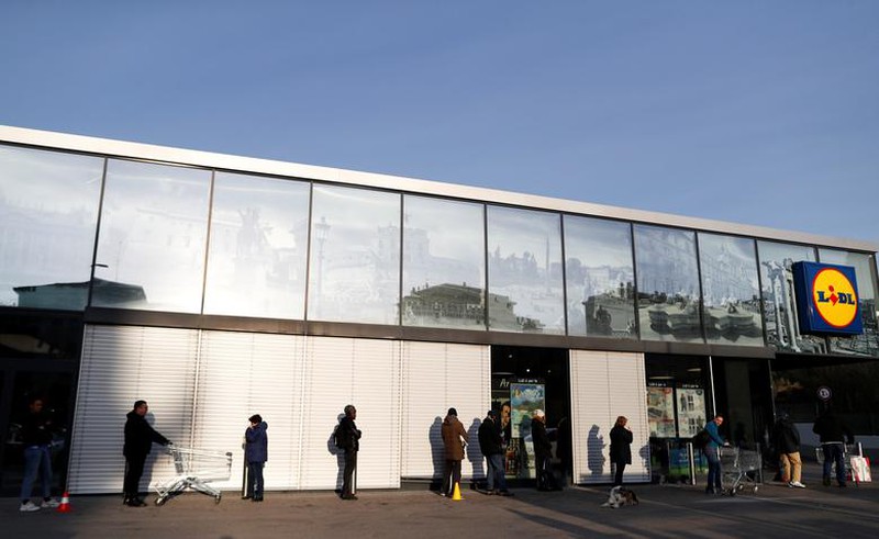 Người dân Rome, Italy xếp hàng đi siêu thị. |