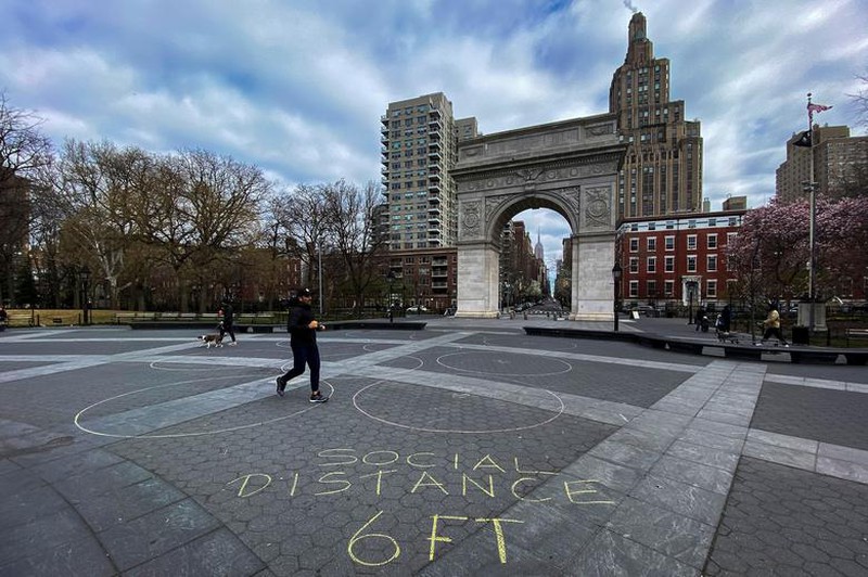 Người dân New York, Mỹ, tập thể dục trong công viên Quảng trường Washington. Trong khuôn viên là những hình tròn và dòng chữ "social distancing 6 feet" để nhắc nhở mọi người đứng cách xa nhau. |