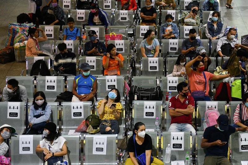 Hình ảnh tại một trạm xe bus ở Thái Lan, mọi người tự động ngồi cách nhau một ghế nhờ những hình dán nhắc nhở. |