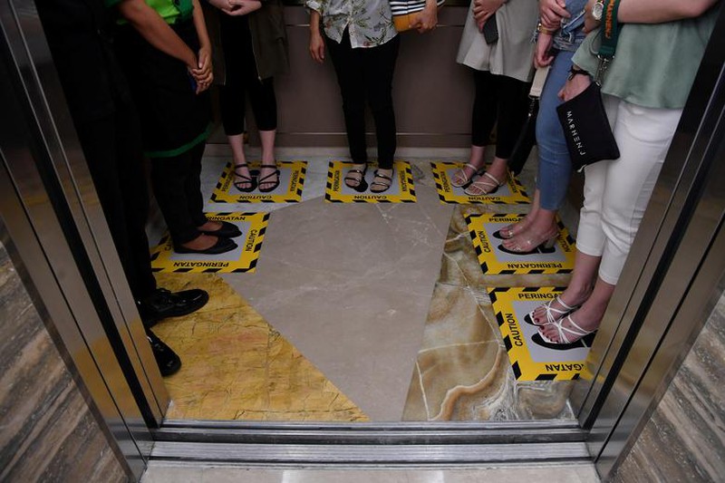 Người đi thang máy đứng vào các ô quy định ở Surabaya, tỉnh Đông Java, Indonesia. |