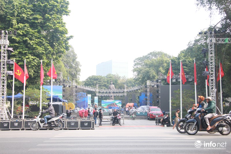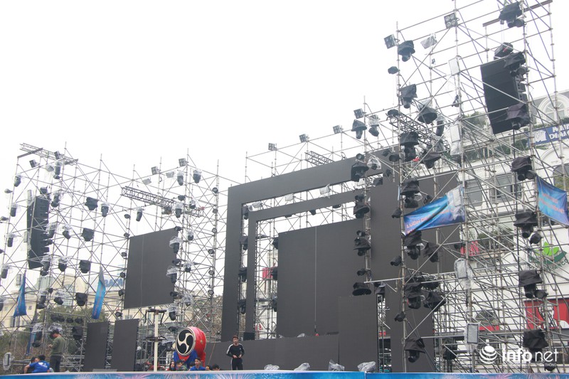 Tại quảng trường Đông Kinh Nghĩa Thục, quận Hoàn Kiếm (Hà Nội), một sân khấu lớn với rất nhiều màn hình khủng đã được lắp đặt. |