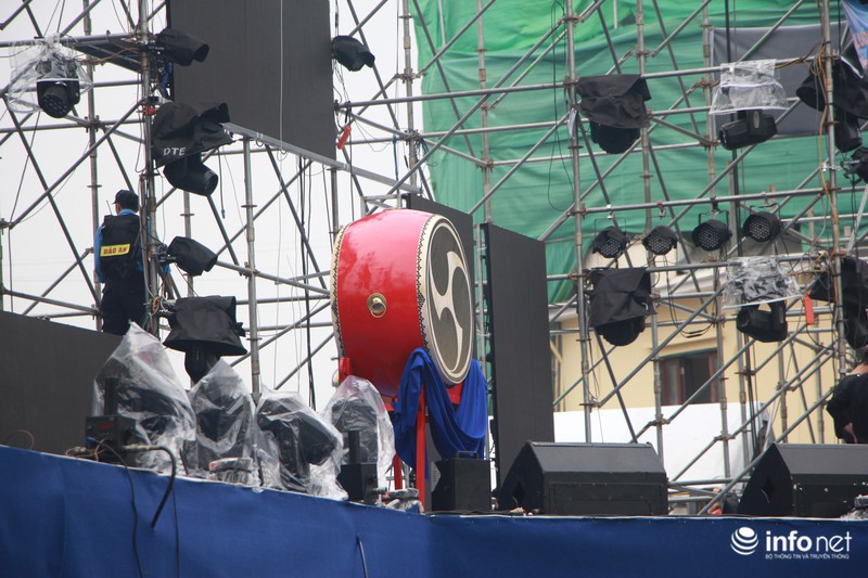 Rất nhiều đạo cụ chuẩn bị cho các màn trình diễn âm nhạc, ánh sáng đã được đưa đến. |