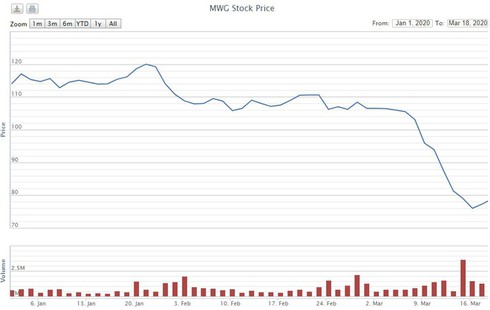 Tăng giá ấn tượng vào nửa cuối 2019 nhưng từ đầu năm nay, cổ phiếu Thế giới Di động hầu như đi ngang trước khi lao dốc theo đà chung của toàn thị trường. Từ mức đỉnh hơn 120.000 đồng, giá cổ phiếu Thế giới Di động hiện đã về dưới 80.000 đồng.