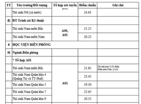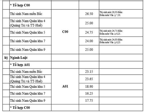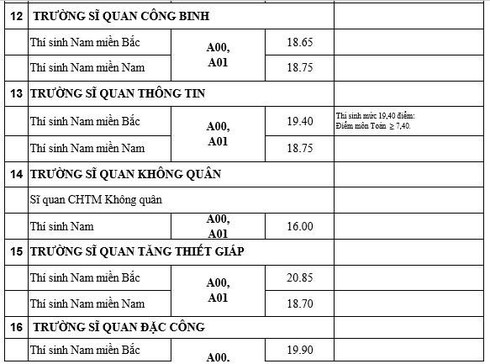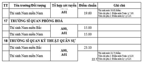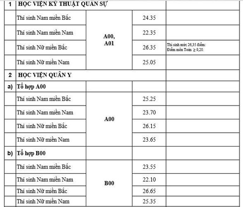 Theo đó, điểm chuẩn đại học, cao đẳng quân sự vào các học viện, trường quân đội năm 2019 như sau: