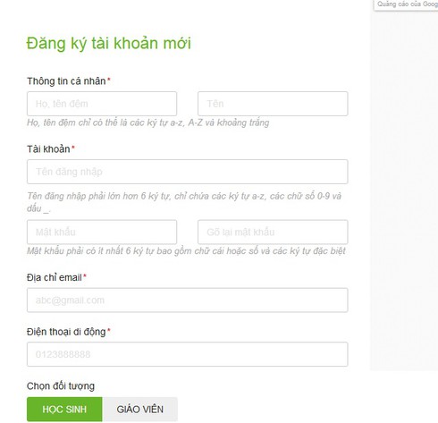 Tại đây bạn có thể chọn đối tượng đăng ký là Giáo viên hay Học sinh.