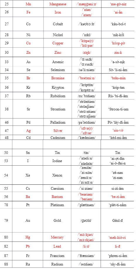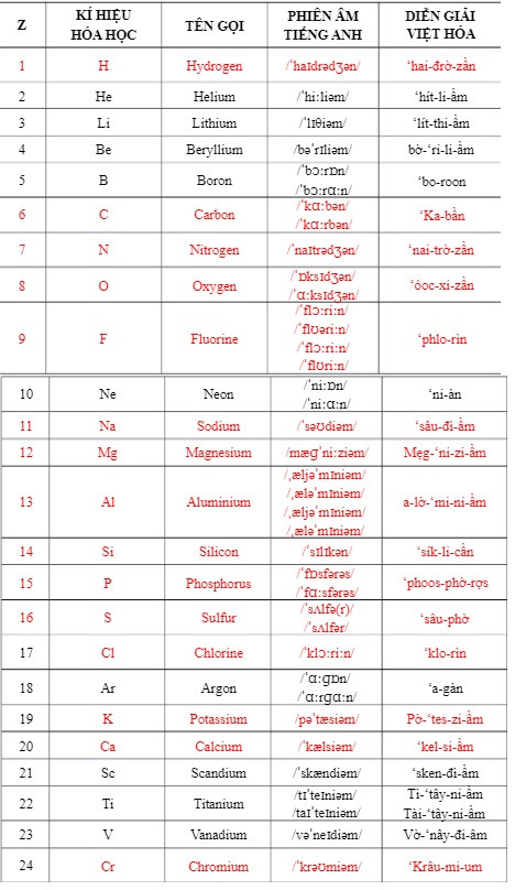 Tham khảo cách đọc tên nguyên tố hóa học theo tiếng Anh: