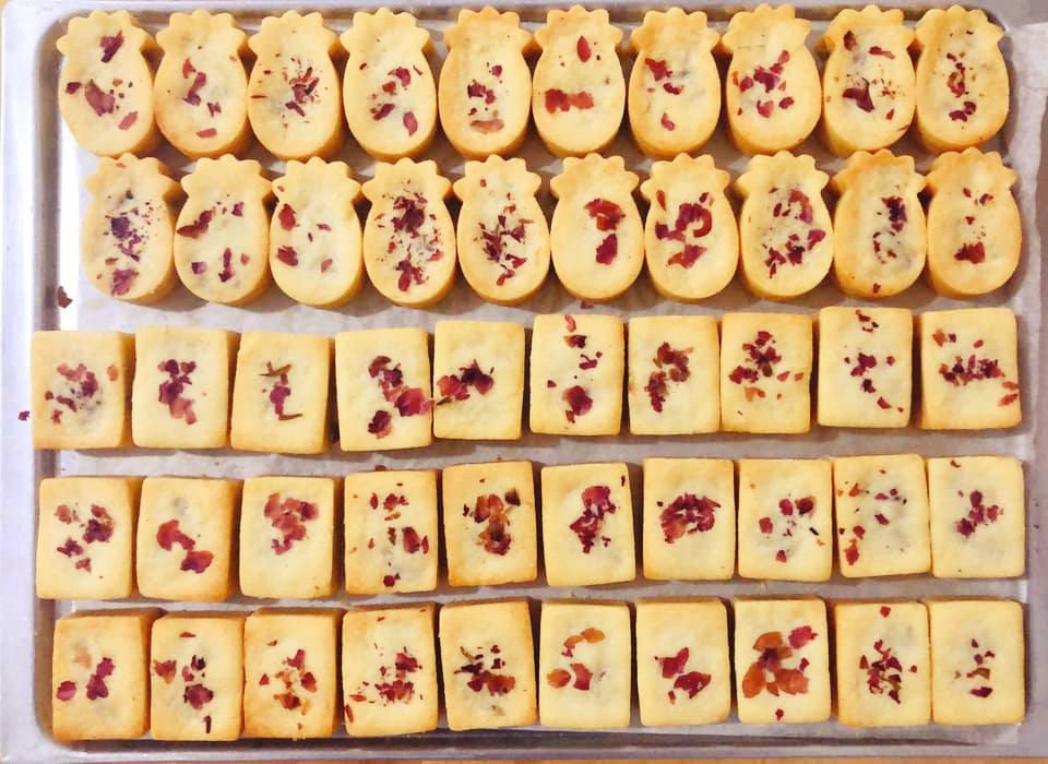 Bánh sau khi nướng xong thơm nức, hoa vẫn giữ được màu đẹp, bánh vỏ mềm, nhân chua chua ngọt ngọt.