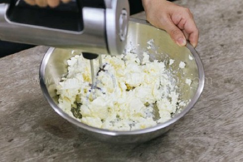 Bước 1: Để kem phô mai ra ngoài để hết lạnh. Khi kem mềm, dùng máy đánh trứng đánh ở tốc độ thấp nhất.