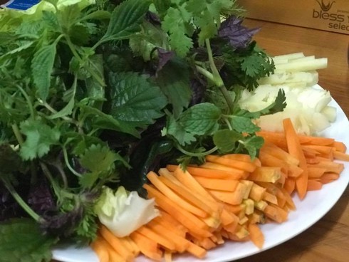 - Rau xà lách, mùi, tía tô, kinh giới, húng bạc hà, diếp cá (thêm rau gì tùy theo sở thích của bạn)