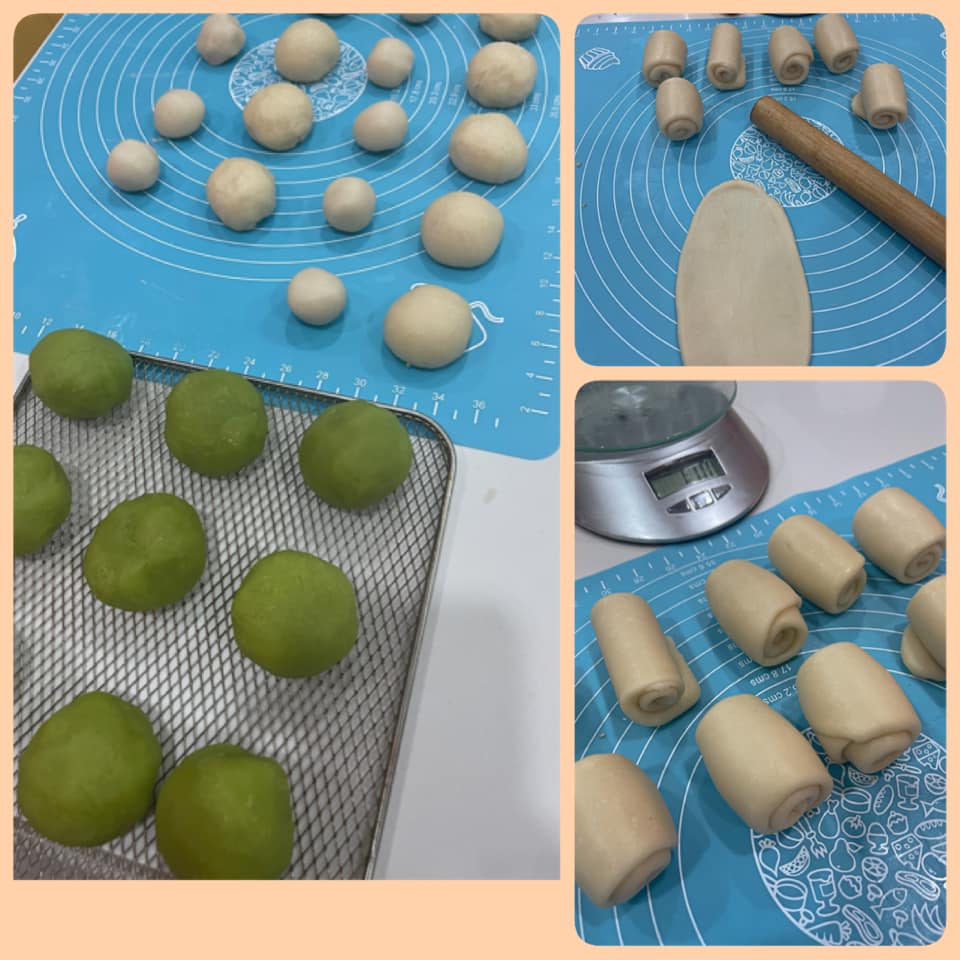 Cho trứng muối vào lò nướng sơ. Chia phần nhân trà xanh làm 9 phần, mỗi phần nhân bọc lấy 1 lòng đỏ trứng muối. Cả nhân và trứng muối sẽ nặng khoảng 60-70g.
