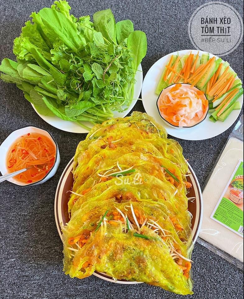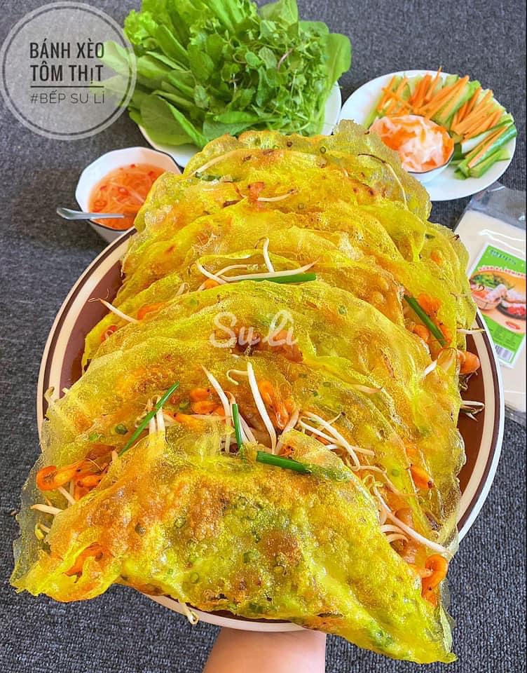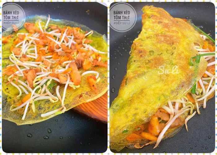 Lưu ý, nếu đổ bánh xèo nhiều ăn không hết muốn bánh giòn trở lại thì cứ đặt lên chảo chống dính, bật lửa đun một lúc là được.