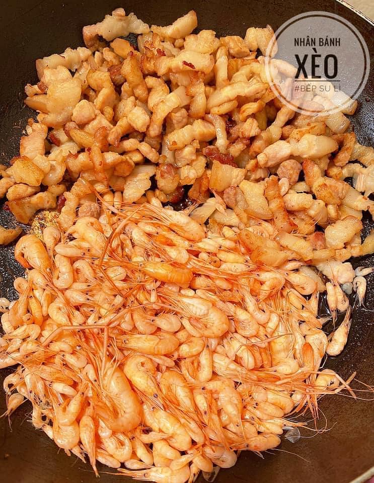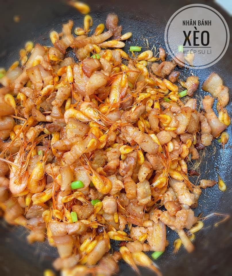 - Vẫn chảo đó, cho thịt vào áp chảo cho thịt ba bớt mỡ rồi chắt bớt mỡ đi. Thêm 1 thìa cà phê bột điều vào đảo. Bột điều làm cho nhân cho màu đẹp. Cho thêm hành phần gốc trắng vào đảo thơm. Cho tôm vào, nêm gia vị bột canh, mì chính cho vừa miệng rồi tắt bếp.