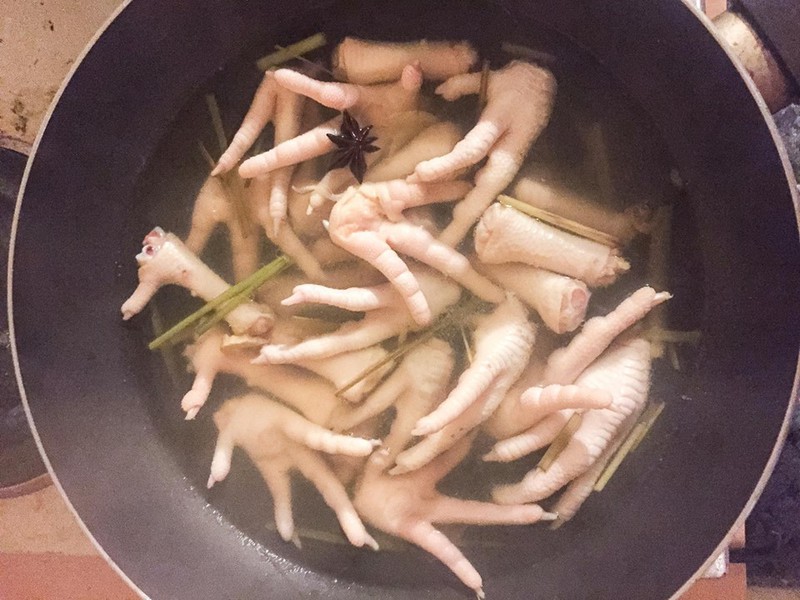 Bước 3: Nấu nước sôi, luộc chân gà với gừng và 1/2 sả đập dập và 1 bông hoa hồi.