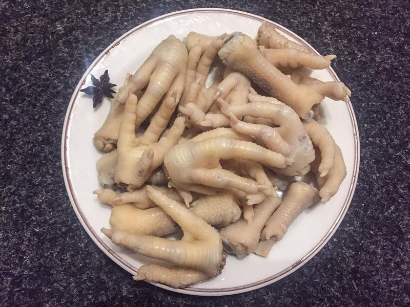 Khi chân gà chín tới, vớt ra cho vào nước đá lạnh cho nguội, vớt ra. Cho chân gà vào ngăn mát tủ lạnh khoảng 20 phút để có độ giòn.