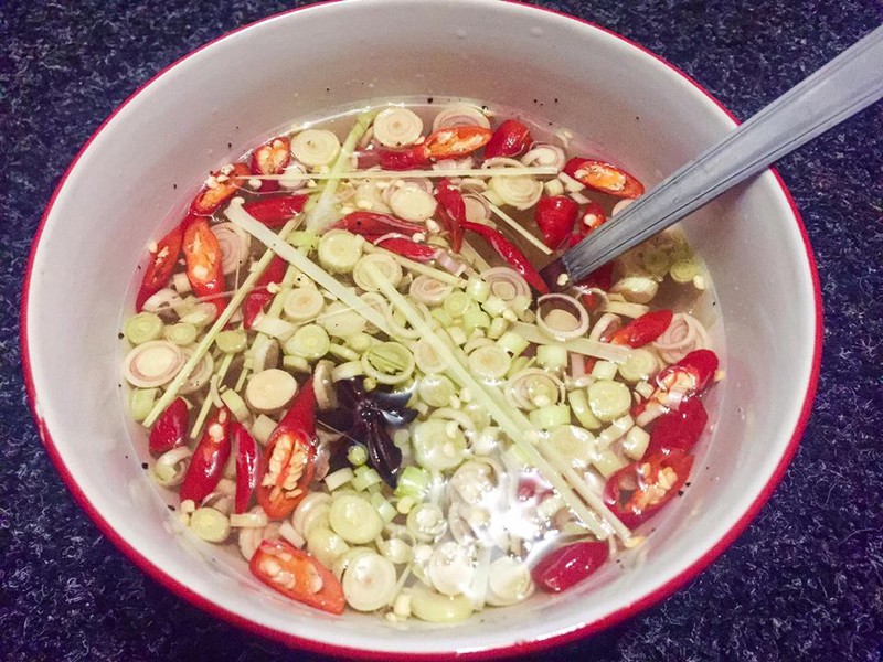 Khuấy tan hỗn hợp rồi đun sôi, và để nguội. Khi hỗn hợp nguội, các bạn cho sả, ớt, hoa hồi vào. Nếu muốn ăn cay, chua hơn, bạn có thể tăng số lượng ớt, tắc.