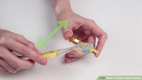 Bước 2: Dùng bàn chải đánh răng loại lông mềm mịn, quét hỗn hợp trên và chà nhẹ lên trang sức. Ngoài ra, bạn cũng có thể chà trực tiếp kem đánh răng lên trang sức mà không cần pha thêm nước. Tuy nhiên, cách đó khiến cho kem đánh răng rơi vào kẽ trang sức, khó làm sạch.