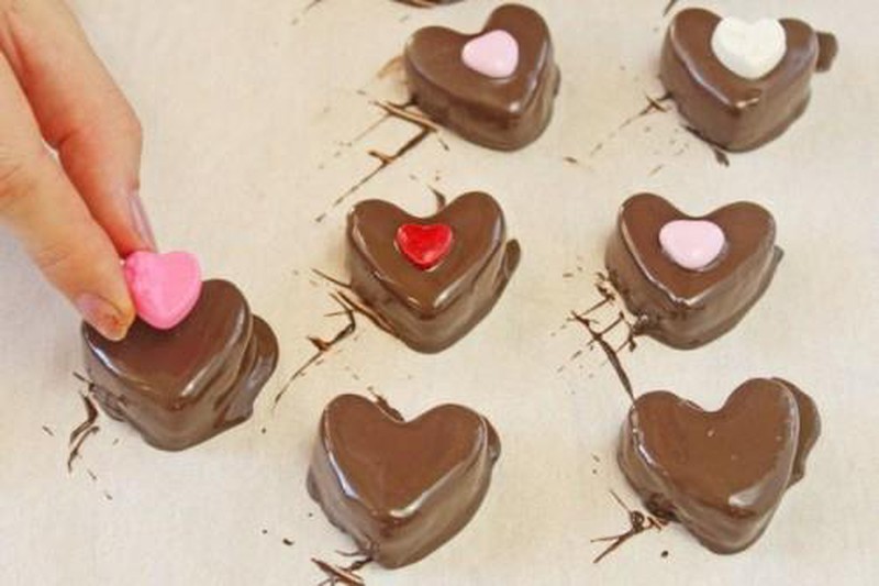 Bạn lấy dĩa để nhúng kẹo sôcôla trái tim vào lớp phủ để sôcôla bao bọc hoàn toàn lấy kẹo, đợi các giọt sôcôla thừa rơi hết thì bạn đặt sôcôla vào tấm giấy nến.Trong khi sôcôla phủ còn đang ướt, bạn dùng tay ấn 1 kẹo trang trí hình tim vào giữa mặt viên sôcôla nếu muốn. Thực hiện như thế cho đến khi hết sôcôla. |