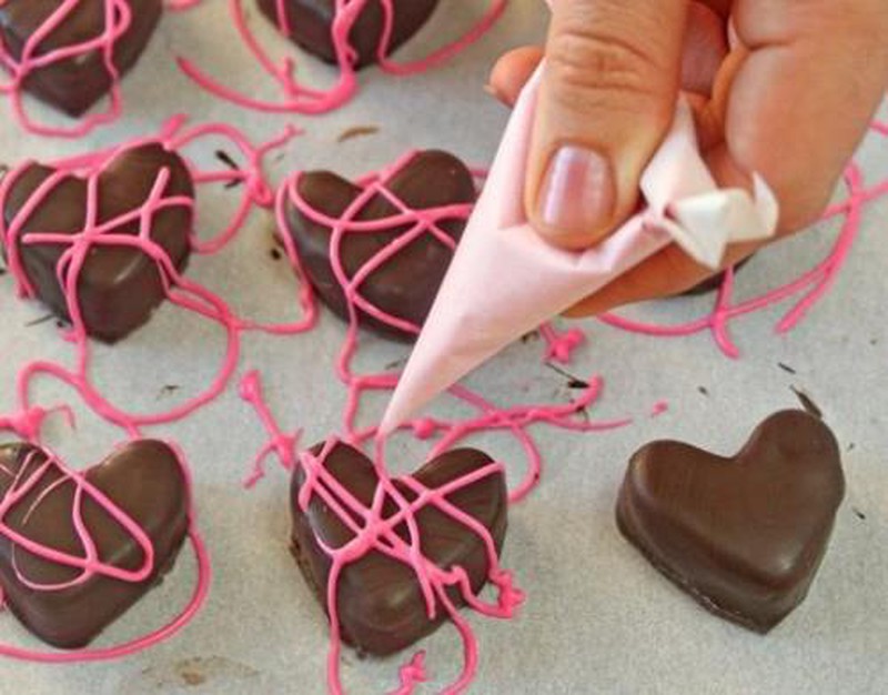 Bước 6:Cho sôcôla hồng vào túi bắt kem rồi đặt trong lò vi sóng đun chảy. Dùng kéo cắt 1 lỗ nhỏ ở đầu túi bắt kem, rồi tiến hành trang trí những vệt màu hồng sặc sỡ lên viên sôcôla. Trang trí xong, bạn đặt khay sôcôla vào tủ lạnh 15 phút cho đông cứng là được. |